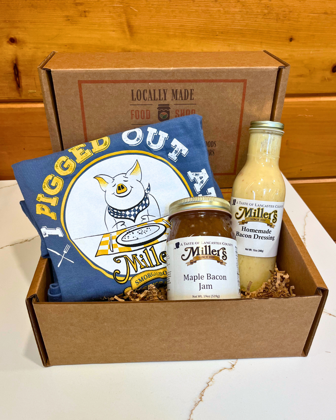 Celebrate bold flavor and fun with this unique gift collection. Choose a classic “I Pigged Out at Miller’s Smorgasbord” T-shirt in blue or black, then indulge in two savory favorites: Maple Bacon Jam, a sweet and smoky spread perfect for burgers, cheese boards, or breakfast treats, and Homemade Bacon Dressing, a creamy blend loaded with real bacon that’s ideal for salads, potatoes, or dipping. A perfect gift for anyone who can’t resist bacon!