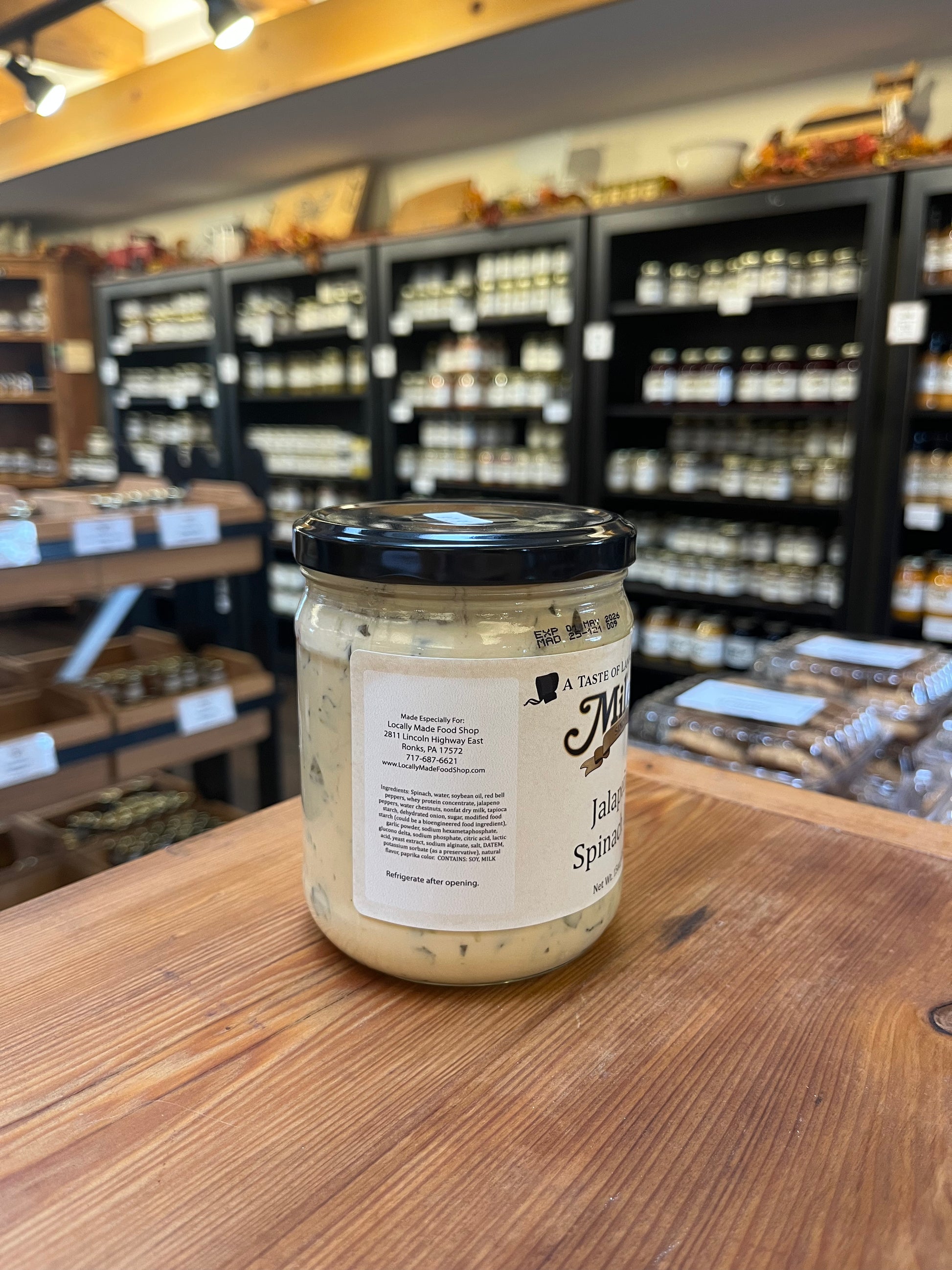 Ingredients: Spinach, water, soybean oil, red bell pepper, whey protein concentrate, jalapeno peppers, water chestnuts, nonfat dry milk, tapioca starch, dehydrated onion, sugar, modified food starch, garlic powder, sodium hexametaphosphate, glucono delta, sodium alginate, salt, DATEM, potassium sorbate (preservative), natural flavor, paprika color. CONTAINS: Soy, Milk.