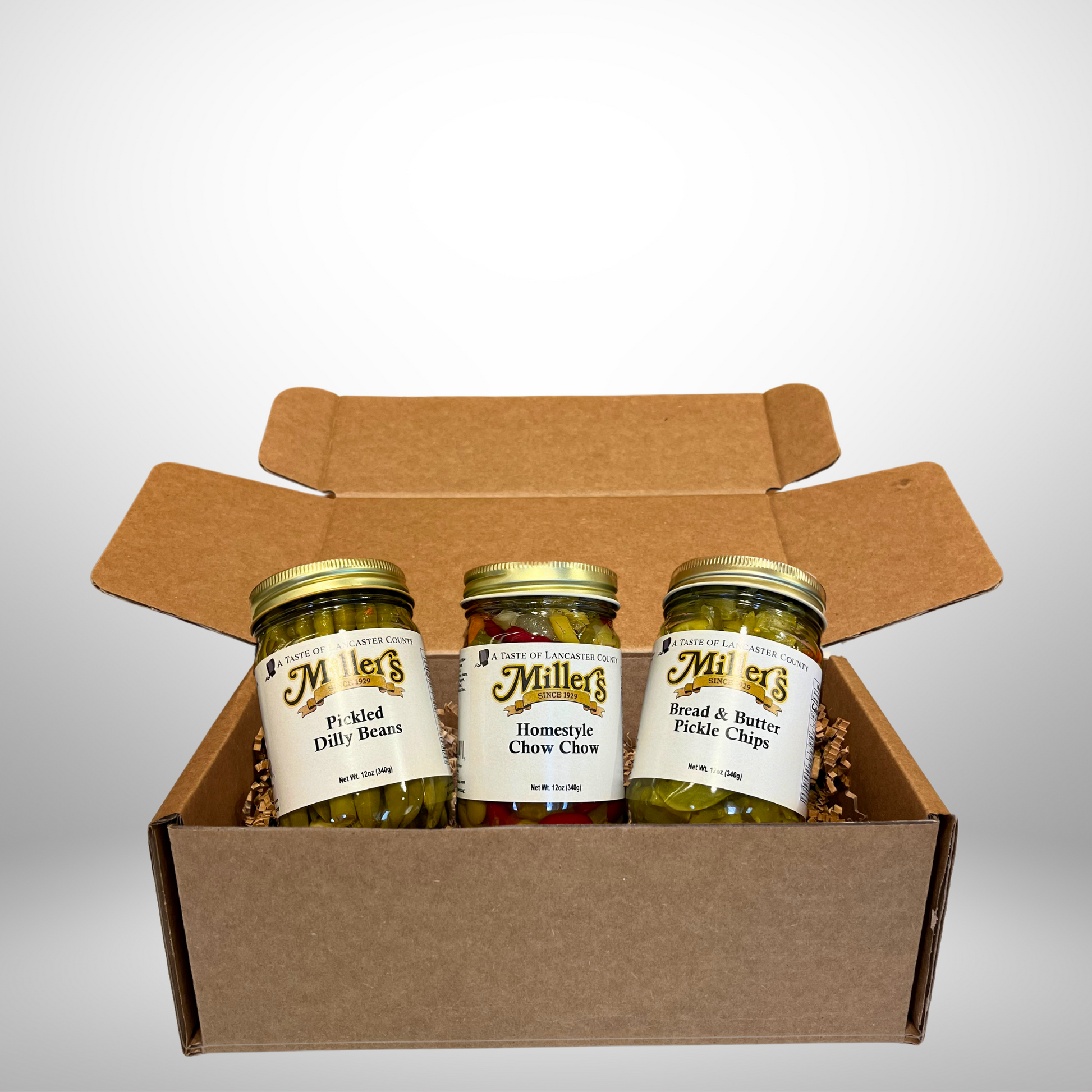 A trio of tangy, sweet, and savory classics come together in this flavorful gift set. Featuring Pickled Dilly Beans with a hint of spice, Homestyle Chow Chow for a zesty crunch, and Bread & Butter Pickle Chips with the perfect balance of sweetness and tang, this box is a must-have for pickle lovers. Perfect on sandwiches, appetizer trays, or enjoyed straight from the jar, it’s a delicious taste of Lancaster in every bite.