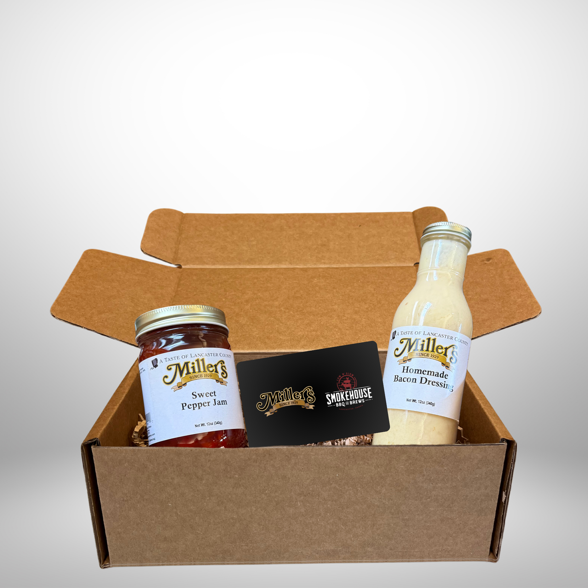 This thoughtfully curated gift set features two guest favorites from our famous smorgasbord: Sweet Pepper Jam and Bacon Dressing—perfect for enhancing meals with a touch of Lancaster County flavor. It also includes a gift card in the amount of your choice, making it a delicious and flexible gift for anyone who loves homestyle cooking.