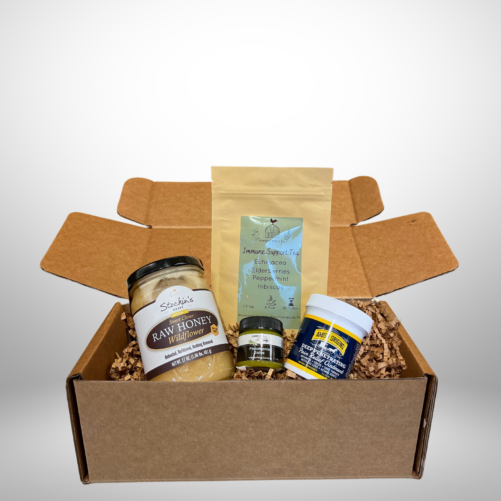 Homestead Herbs & Teas – Immune Support Tea – A fragrant, all-natural blend of echinacea, elderberries, peppermint, and hibiscus to help fortify the body’s defenses.