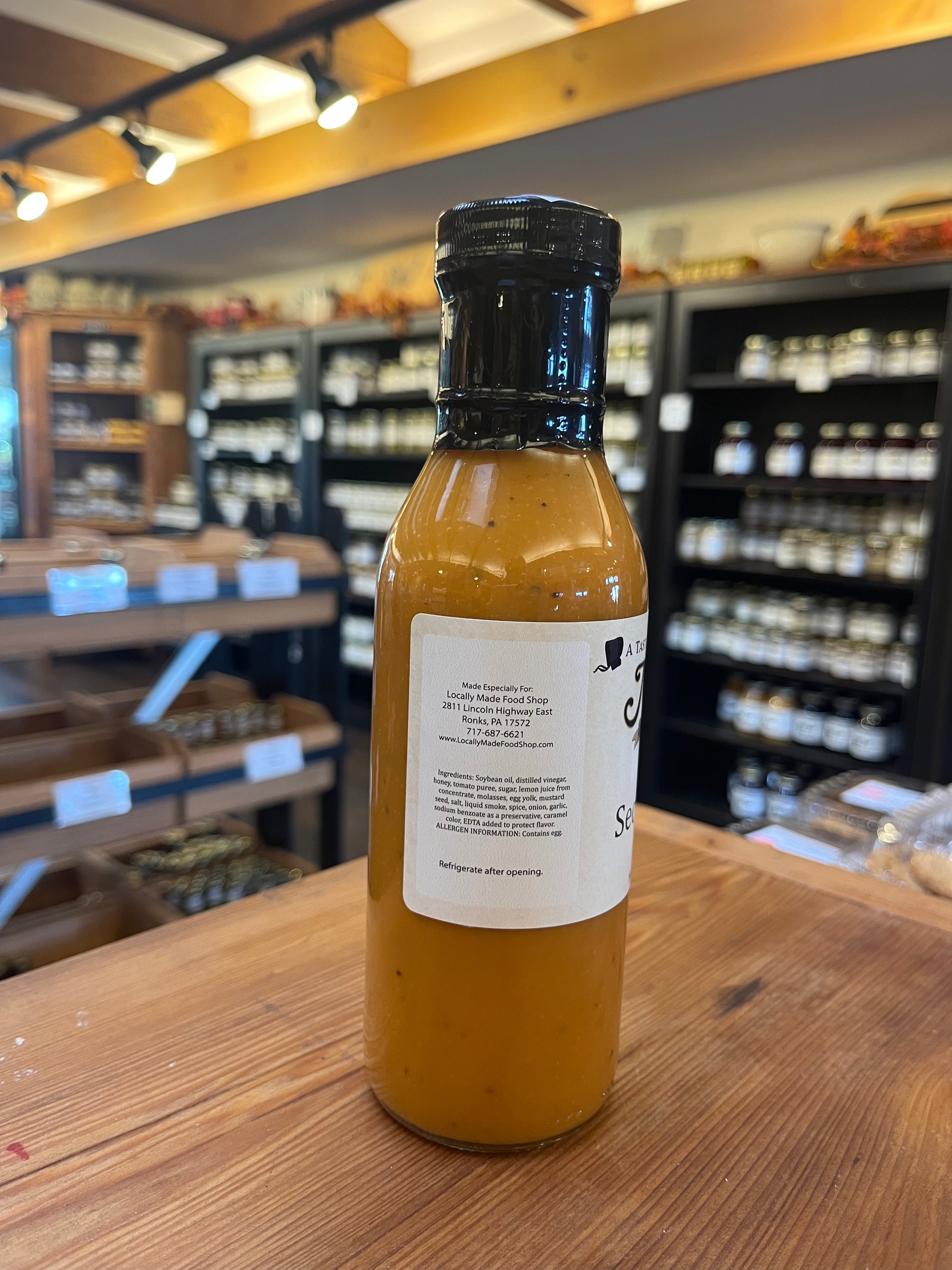 Ingredients: Soybean oil, distilled vinegar, honey, tomato puree, sugar, lemon juice from concentrate, molasses, egg yolk, mustard seed, salt, liquid smoke, spice, onion, garlic, sodium benzoate (preservative), caramel color, EDTA added for flavor. CONTAINS: Egg.